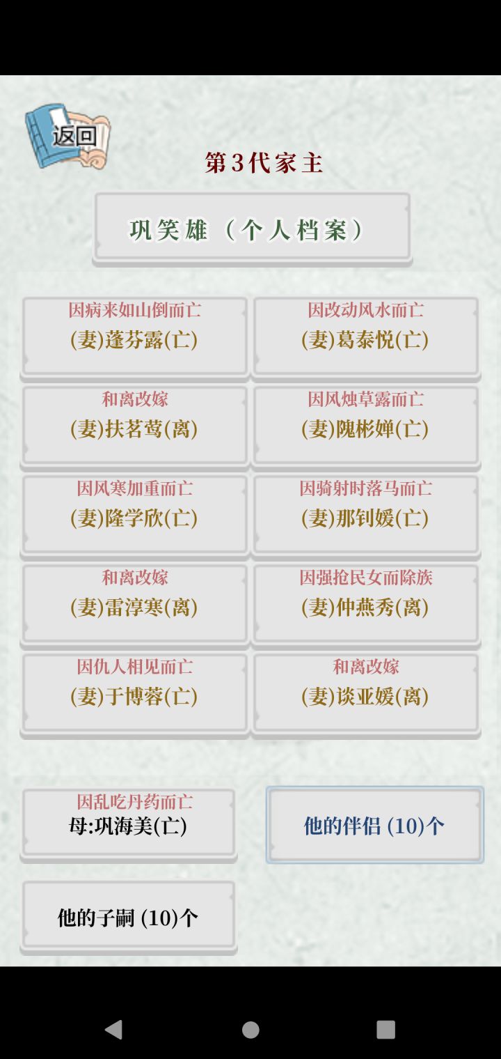到了第三代人多了以后,数值就会自己一溜的上去。一下没去看,再回头看时就99了。减的还没加的快。而且,王朝好难过阿,玩了五六百不是刺杀杀没了人,就是莫名奇妙被推翻。还有,刚出生就当家主认真的吗,不要曲解老祖宗的意思啊 世家是不是也可以因为一些事件导致被王朝覆灭?我都世家了,娶嫁的媳妇儿媳,女婿居然还是身家不详的人?我怕是个假世家,王朝的时候,家主还可以随意娶亲,妻子可以随意离合。我怕是个假的王朝