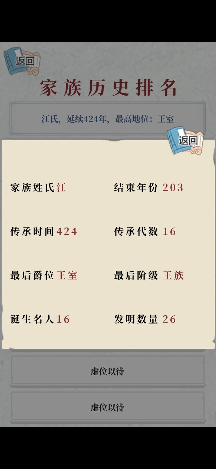 1.玩法有些单一前面节奏还可以,后面就是刷刷刷攒声望,攒人口,钱都很富裕也不用攒。2.天资天赋对于游戏影响提现的不明显,因为事件出现过于随机,也没有说性格特点队伍事件出现有什么影响(可能是我没注意),导致个人后面的事件对于整体家族的影响比重越来越低,后面就是无关紧要了,还是刷声望