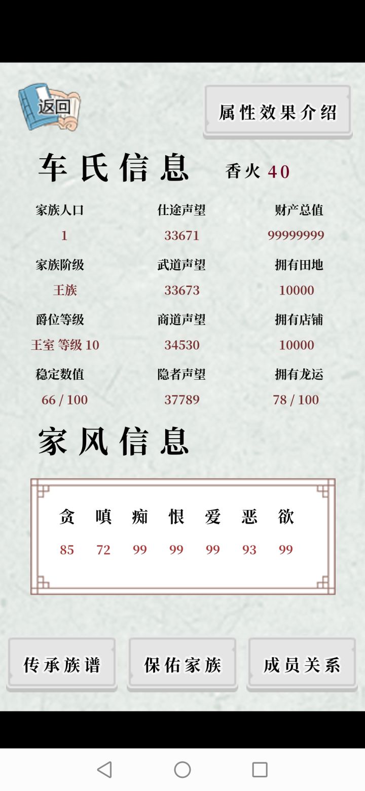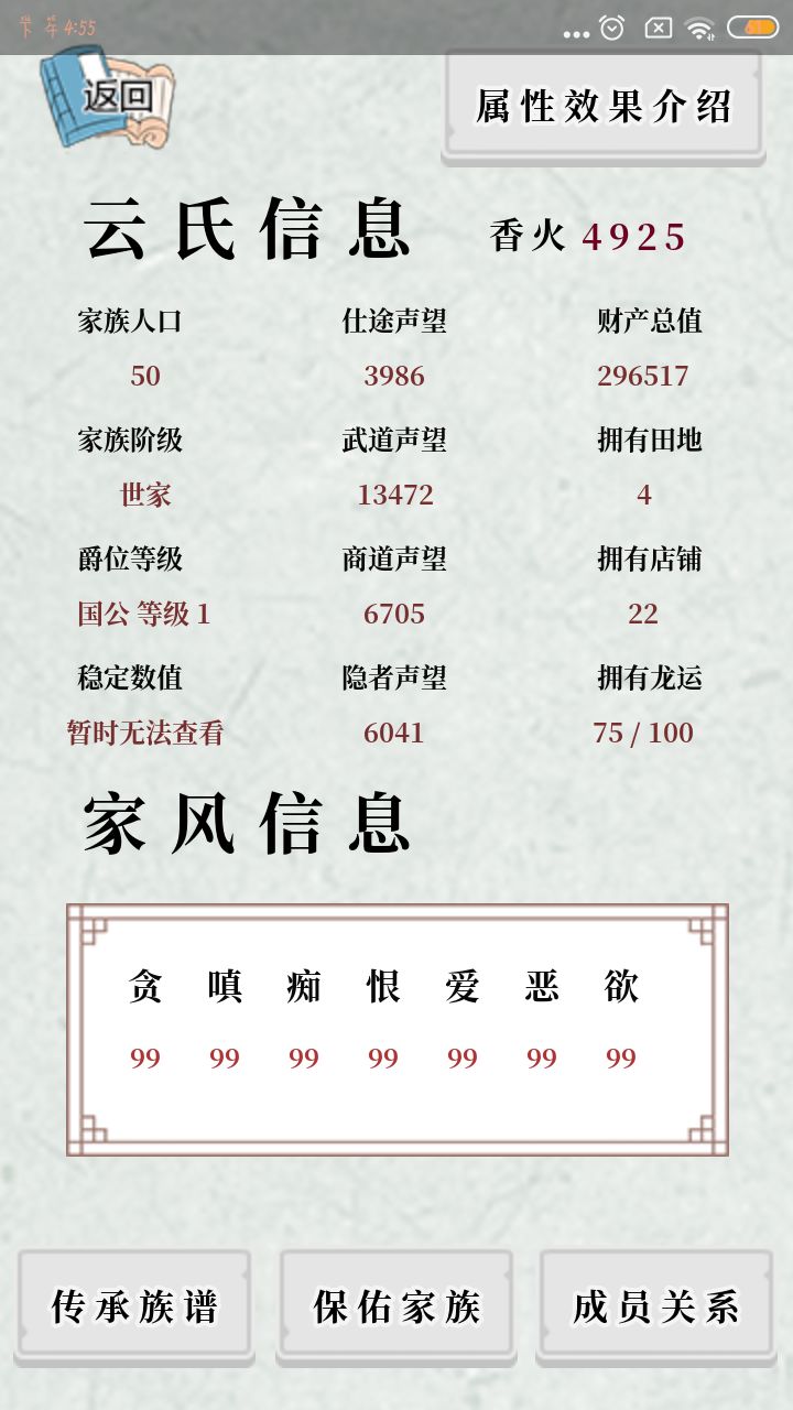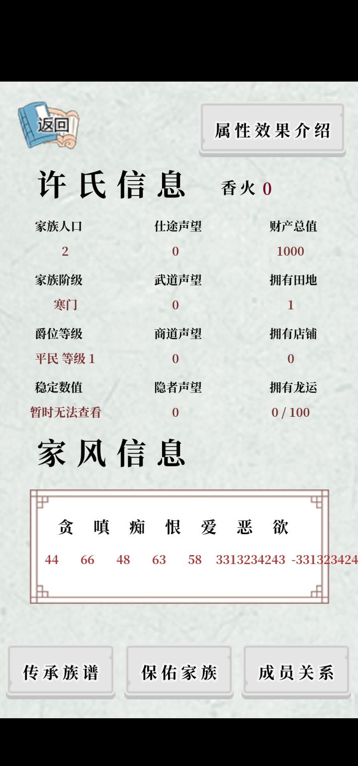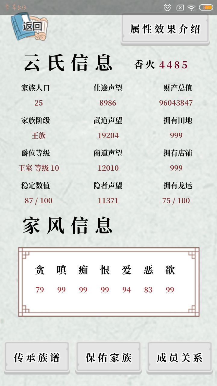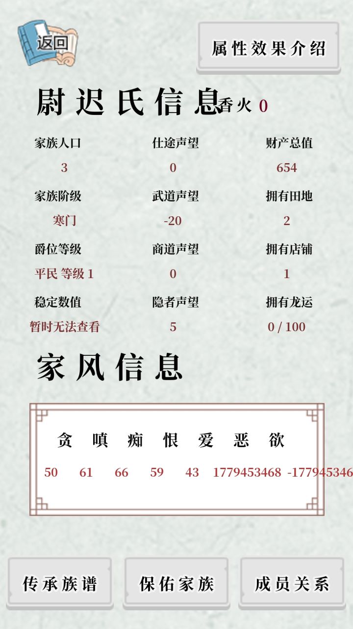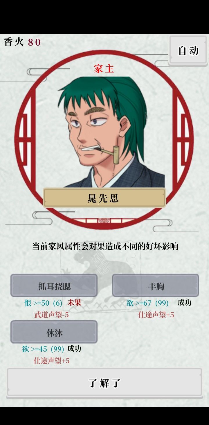 游戏不错,但是对新手太不友好,烛火摇曳和牌位倒下,这两个选项,新手根本不知道哪个是同意哪个是不同意,只能一次次的试错,这个地方差评。第二就是制作组没讲清分家的具体,我一大家子五十多人,搞了个天命之子的小孩当家主,分家之后我直接麻爪了,就只有这一个小孩在家里,其他的都分出去了,绝望,又要重新攒人口😭
