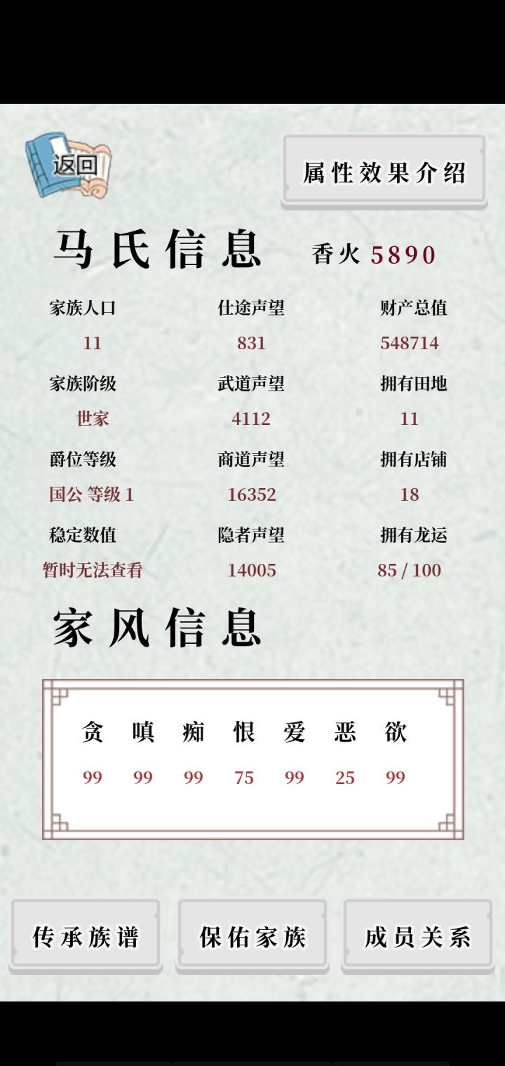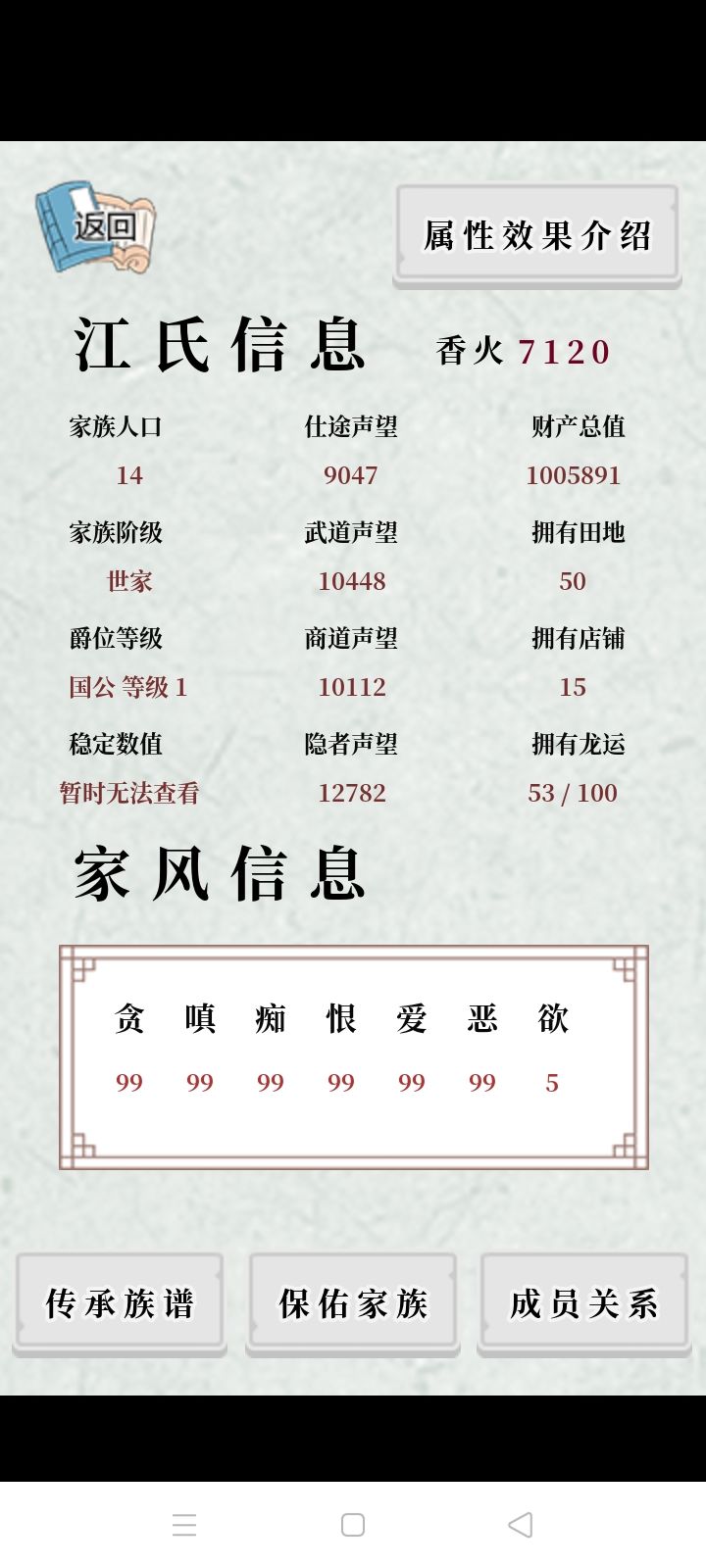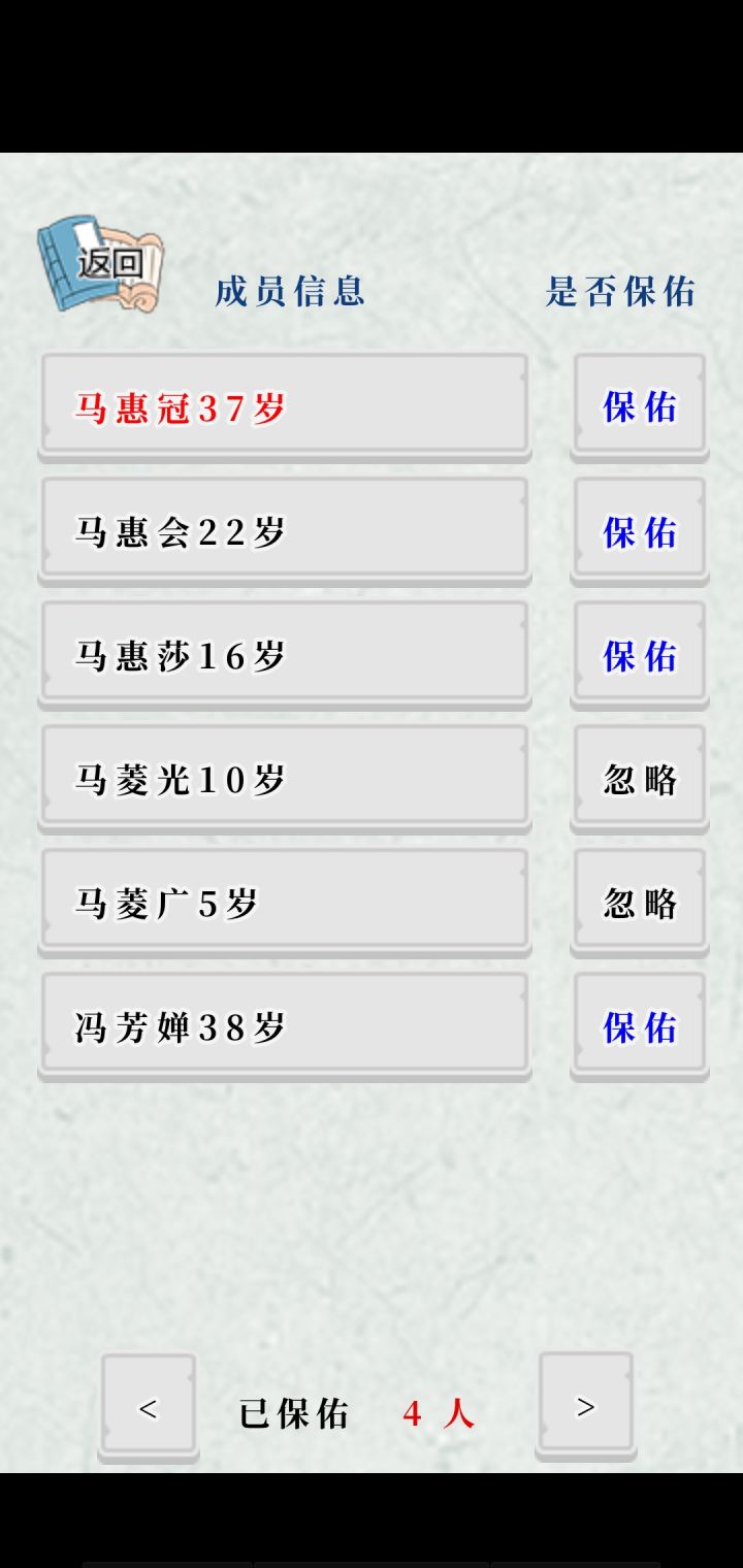 1.点存储本段家族故事到游戏文件夹,起先以为没反应,然后点重新开始,出去后回到历史回顾,把原有的家族覆盖了(我原来保存了一个邢氏的)。2.家族人口显示11人,在保佑里面只看到6个。