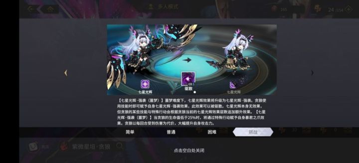 【七星光辉·强袭(噩梦)】噩梦难度下,七星光辉效果将升级为七星光辉·强袭。贪狼使用技能时即可赋予自身七星光辉·强袭效果,此效果可以被驱散。七星光辉本身无效果,但贪狼的某些技能与特殊行动会根据贪狼当前的七星光辉效果层数追加额外效果。【七星光辉·强袭(噩梦)】当贪狼的生命值低于25%时,将通过特殊行动赋予自身暴君之爪效果。贪狼以每回合受到伤害为代价,大幅提升自身攻击力。