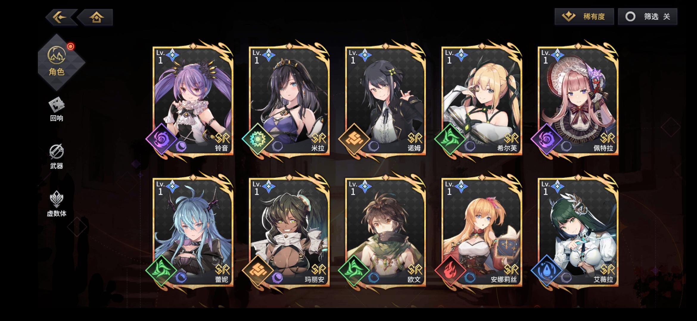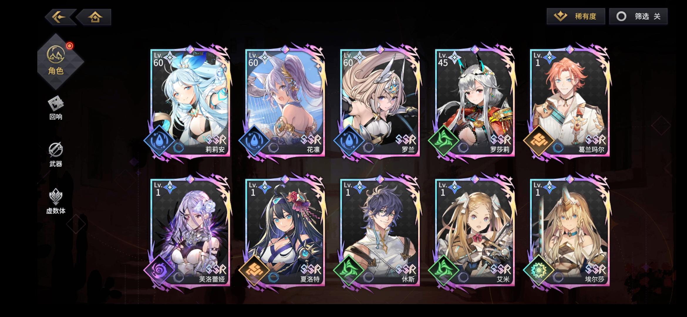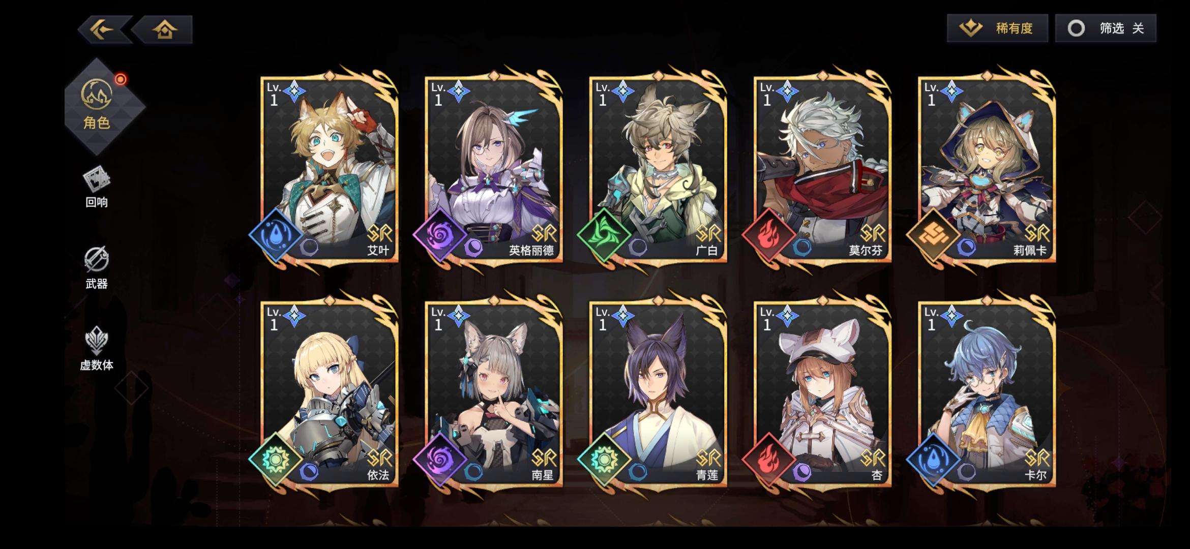 也许我菜,但策划很会教人——别玩游戏好好生活。不是开服入坑,完全没有吃到那波补偿红利,就普通半休闲干了一星期多,一共获得8次ssr。自选十连出了两个,一个土系大爹一个暗系奶,就没舍得再去特意刷水光的了。结果后续池子出货歪的彩虹一样,每个刚好只有一个彩的,终于出两次有同系的,结果来个同调+1。风系白给一个,刚每个系一个ssr,就尼玛得虚空意淫未来建队。既然设计方向是强要求同属性建队,特定卡池就不