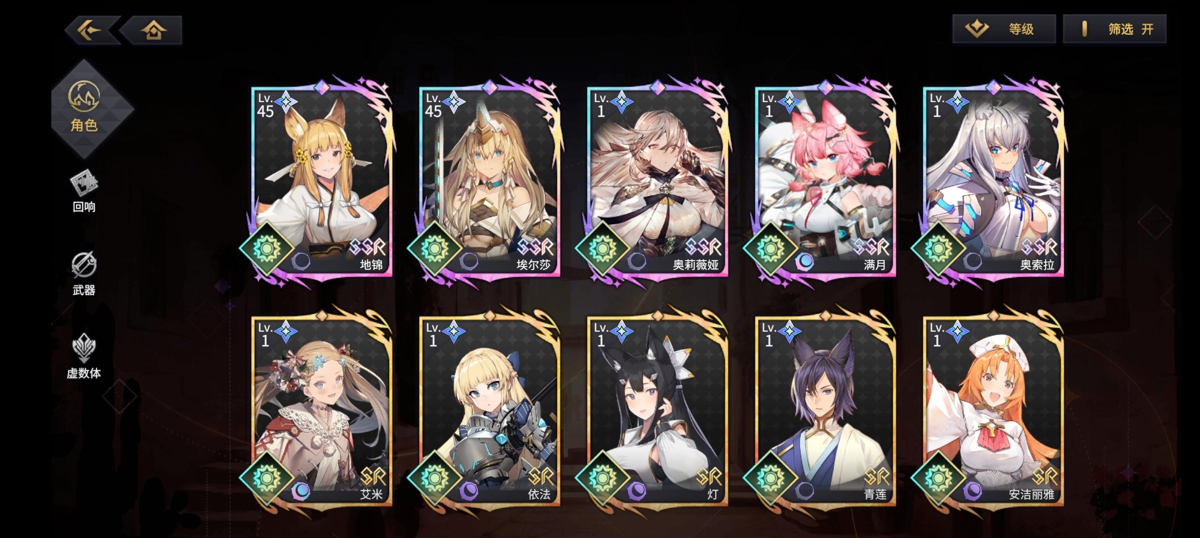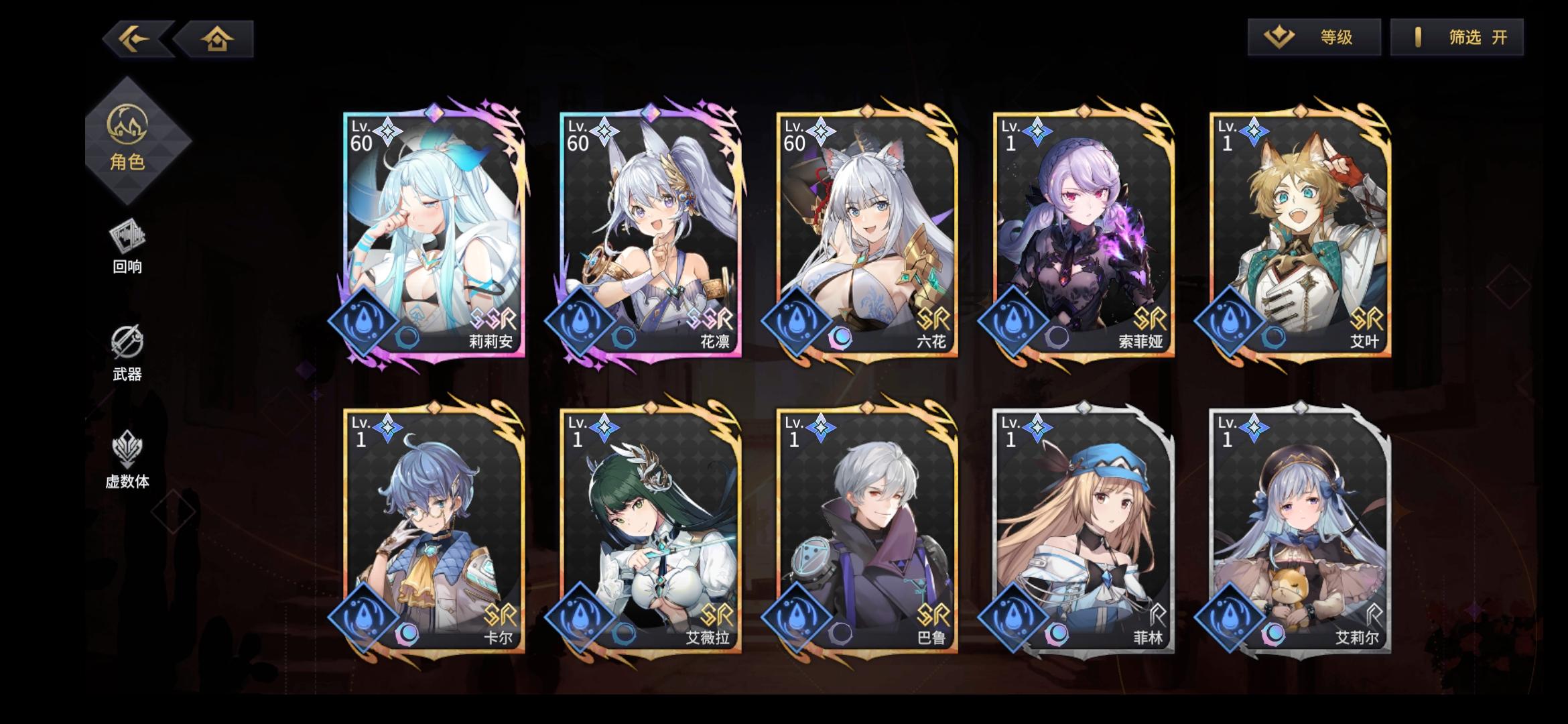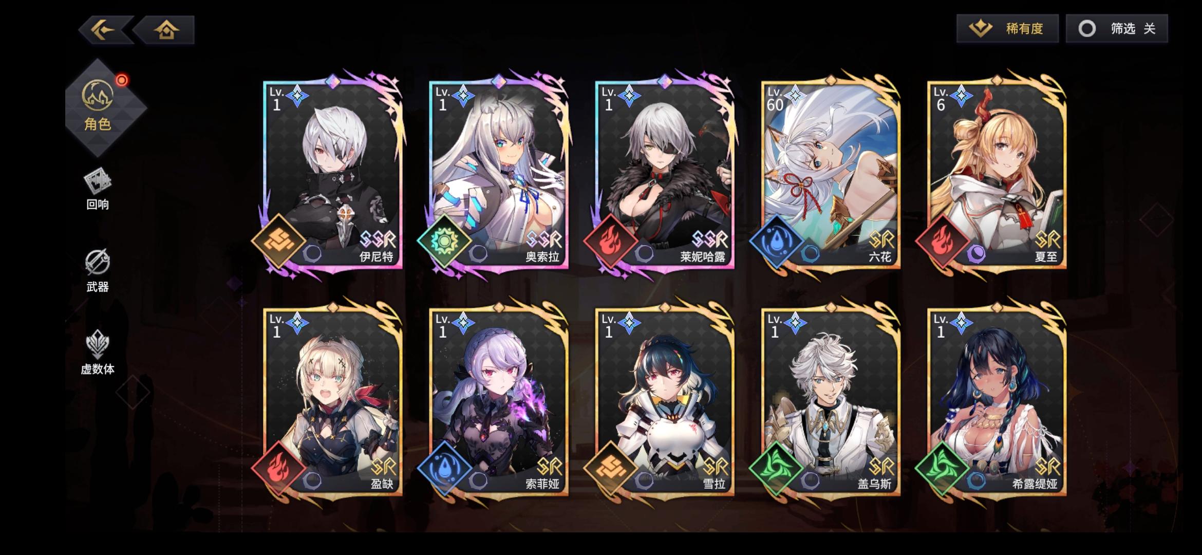 也许我菜,但策划很会教人——别玩游戏好好生活。不是开服入坑,完全没有吃到那波补偿红利,就普通半休闲干了一星期多,一共获得8次ssr。自选十连出了两个,一个土系大爹一个暗系奶,就没舍得再去特意刷水光的了。结果后续池子出货歪的彩虹一样,每个刚好只有一个彩的,终于出两次有同系的,结果来个同调+1。风系白给一个,刚每个系一个ssr,就尼玛得虚空意淫未来建队。既然设计方向是强要求同属性建队,特定卡池就不