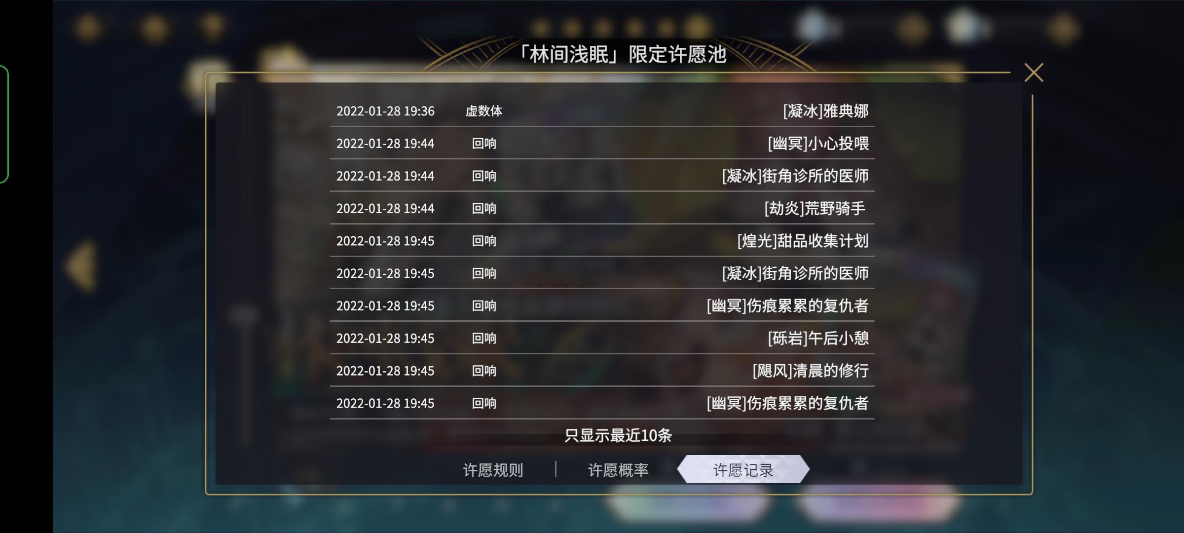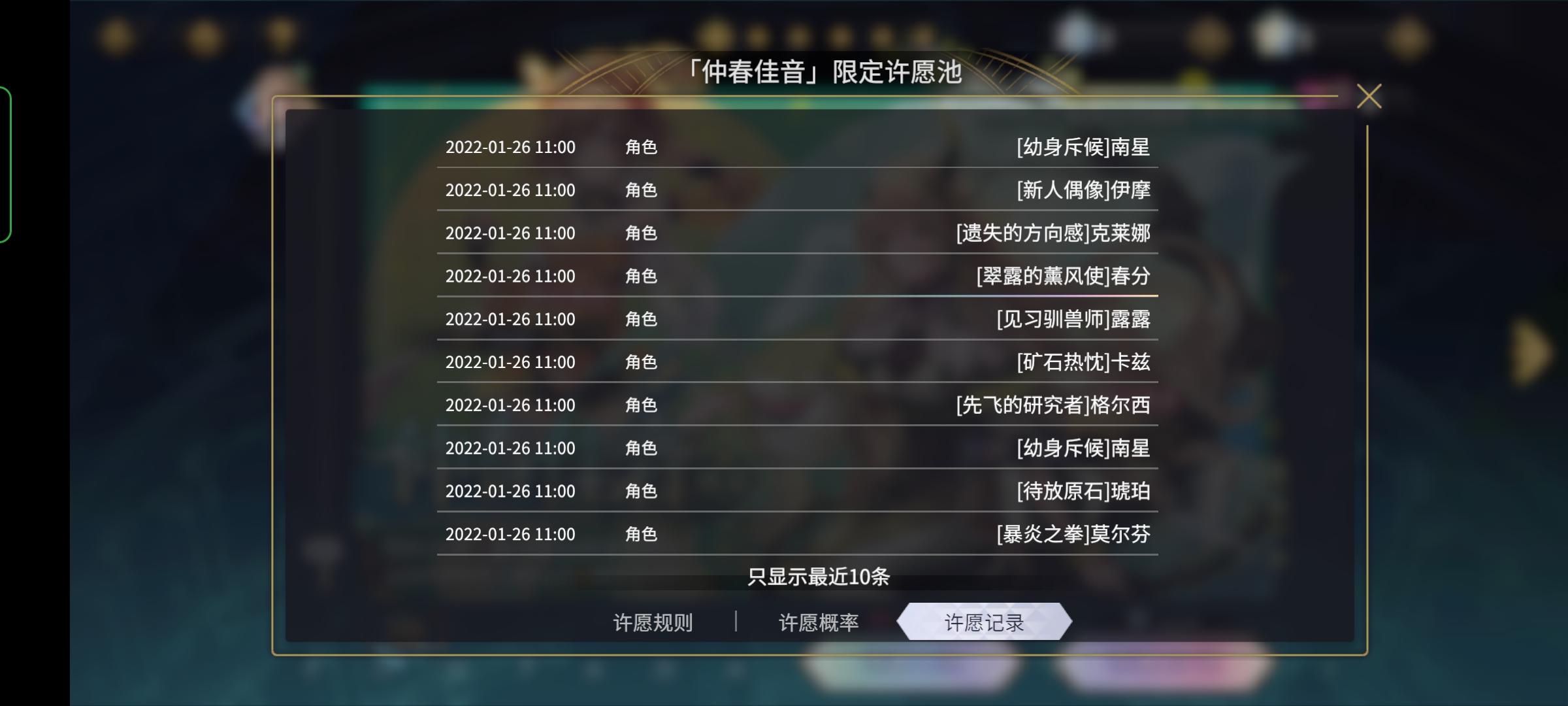 这新池子河里吗30抽,第一个十连角色出春分,第二个十连回响池阿波罗,第三个十连雅典娜+暗ssr回响。。。。玩啥游戏都没见过这场面