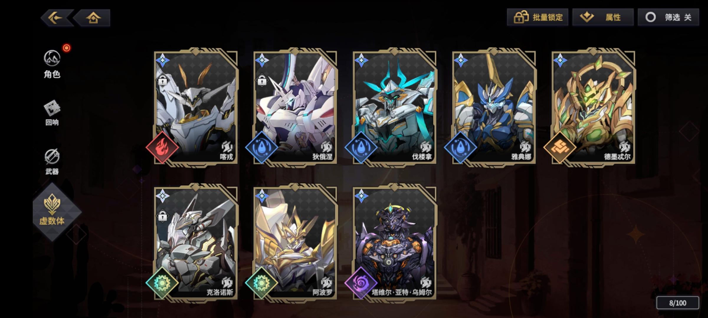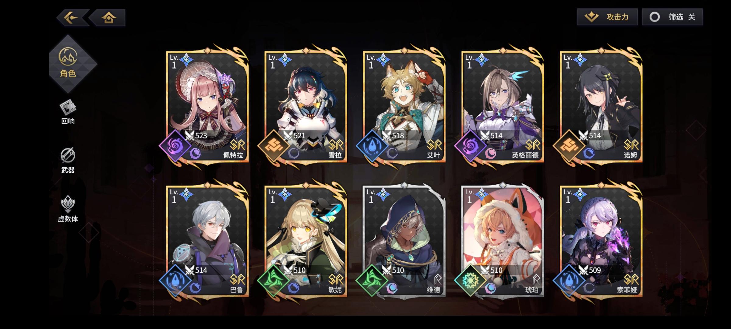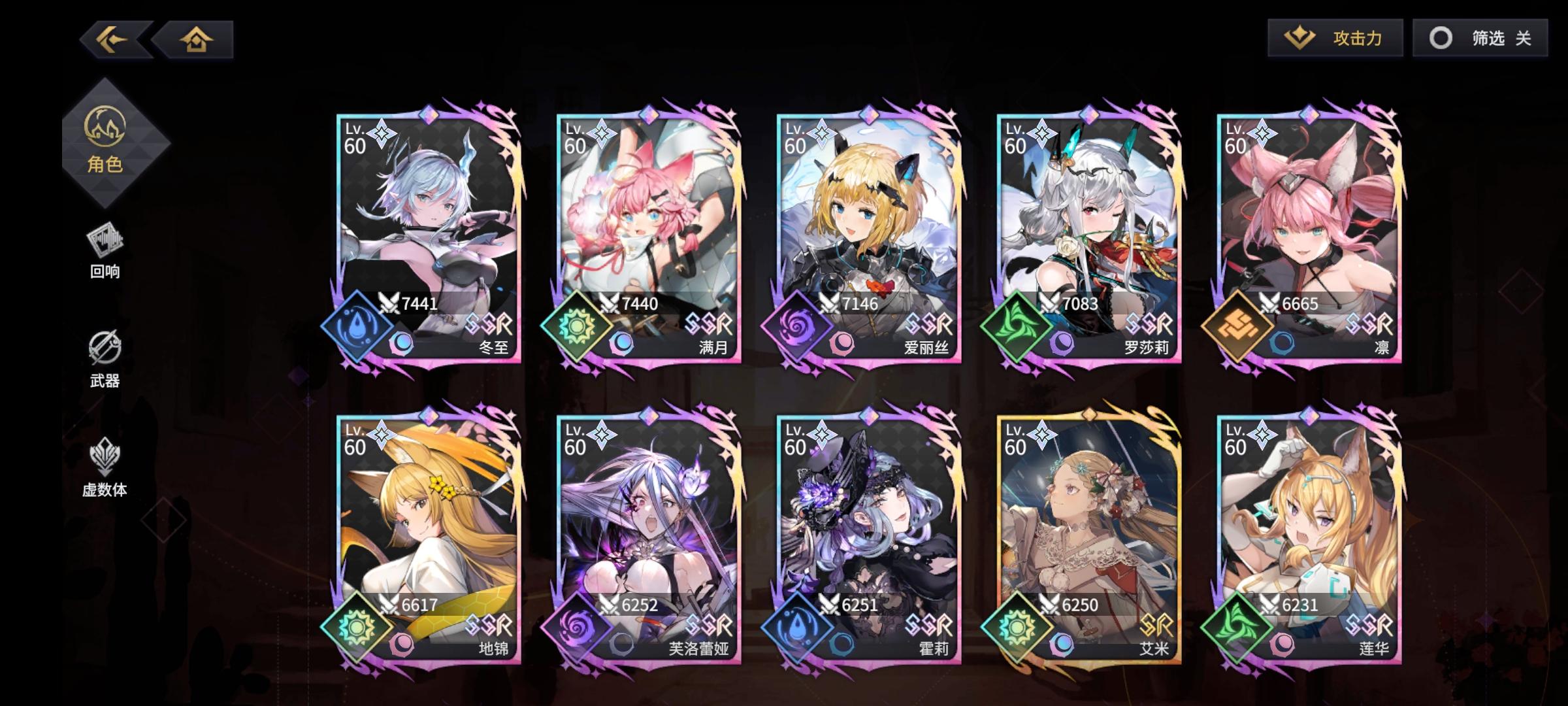 昨天开始玩的,不知道队伍属性概念,新手随便拿了个火t。后面出冬至六花决定水队……刚单抽出的罗兰。听说水队卡尔很重要……什么时候能下主角……不开玩笑了。我一个都不想下,就是塞不进去。