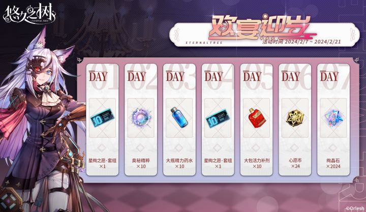 #悠久之树#【欢宴迎岁】签到活动即将开启~◇活动时间◇2月7日 维护后 ~ 2月21日 14:00◇活动说明◇活动期间,探求者大人累计签到达到指定天数即可在【欢宴迎岁】活动面板领取星绚之愿·套组、心愿币、绚晶石等奖励!※签到活动中可获得详细内容请见下图。※详细发放内容以游戏实际内容为准。