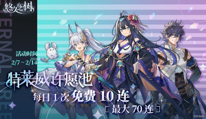 #悠久之树# 「最大70连!」特莱威许愿池活动即将开启~!2月7日维护后,游戏内将举办特莱威许愿池「每日1次免费10连」活动!活动期间,探求者大人们每日可在特莱威许愿池进行1次免费10连许愿,最大70连,还请不要错过!◇活动时间◇2月7日 维护后 – 2月14日 03:59◇注意事项◇1. 每日免费10连机会将于每日4:00进行刷新,每日免费次数不会积累至次日,还请探求者大人及时将免费