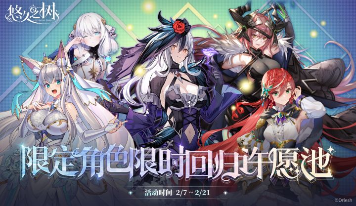 #悠久之树# 【新春限时复刻】限定角色限时回归许愿池即将开启~!持续2周!◇许愿时间◇2月7日 维护后 – 2月21日 14:00◇活动说明◇活动期间,限定角色回归许愿池限时开放!以下角色限时回归,且在本许愿池内邂逅概率大幅提升![彼岸的银之花]瓦沙克、[万剑之炼金术士]奈维利尔、[通往幸福的幻景]奥索拉、[葛莫瑞首领]古蕾雅、[娇小的繁星魔女]妮菲亚、[九霄雷动苍龙起]惊蛰、[银之花的