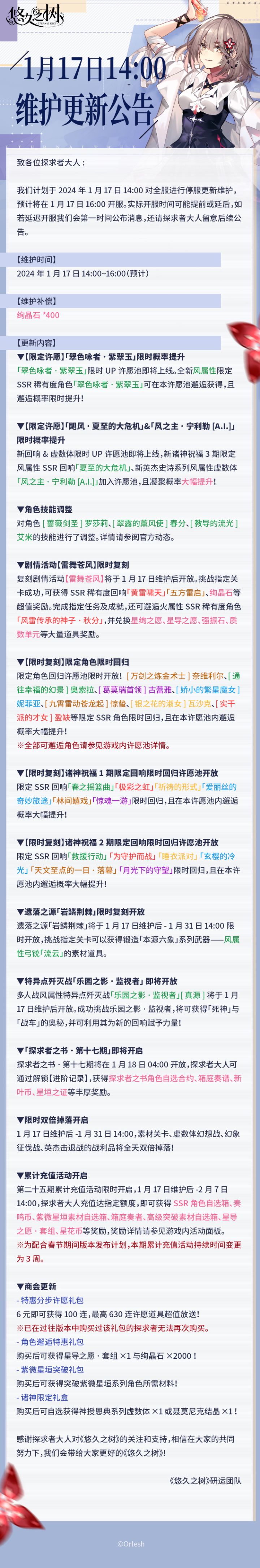 致各位探求者大人:我们计划于2024年1月17日14:00对全服进行停服更新维护,预计将在1月17日16:00开服。实际开服时间可能提前或延后,如若延迟开服我们会第一时间公布消息,还请探求者大人留意后续公告。