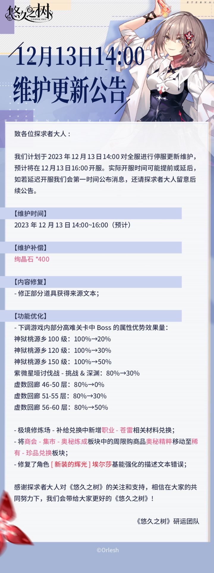 致各位探求者大人:我们计划于2023年12月13日14:00对全服进行停服更新维护,预计将在12月13日16:00开服。实际开服时间可能提前或延后,如若延迟开服我们会第一时间公布消息,还请探求者大人留意后续公告。