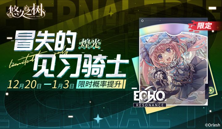 #悠久之树#【限定许愿】「煌光·冒失的见习骑士」限时概率提升~!◇许愿时间◇2023年12月20日 维护后 – 2024年1月3日 14:00活动期间,「煌光·冒失的见习骑士」限时UP许愿池限时开放,新诸神祝福3期系列限定光属性SSR回响「冒失的见习骑士」、新英杰史诗系列光属性虚数体「百勒努斯[A.I.]」加入许愿池!限定光属性SSR回响「冒失的见习骑士」在本许愿池内的凝聚概率大幅提升!在