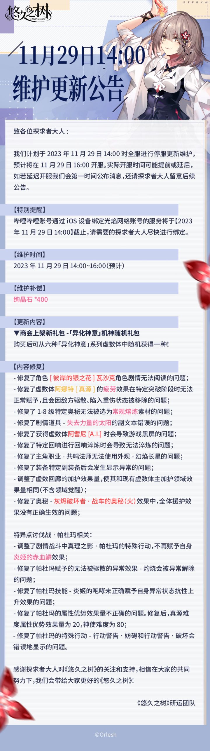 致各位探求者大人:我们计划于2023年11月29日14:00对全服进行停服更新维护,预计将在11月29日16:00开服。实际开服时间可能提前或延后,如若延迟开服我们会第一时间公布消息,还请探求者大人留意后续公告。