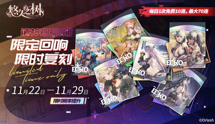 【限时复刻】「每日1次免费10连」诸神祝福1期限定回响限时回归许愿池即将开启~!◇许愿时间◇11月22日 维护后 – 11月29日 维护前◇活动说明◇活动期间,限定回响回归许愿池限时开放!限定SSR回响「春之摇篮曲」「极彩之虹」「祈祷的形式」「爱丽丝的奇妙旅途」「林间嬉戏」「惊魂一游」限时回归,且在本许愿池内邂逅概率大幅提升!※11月22日 维护后-11月29日 03:59,每日可在本许