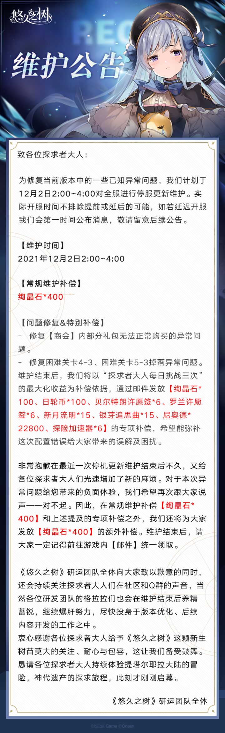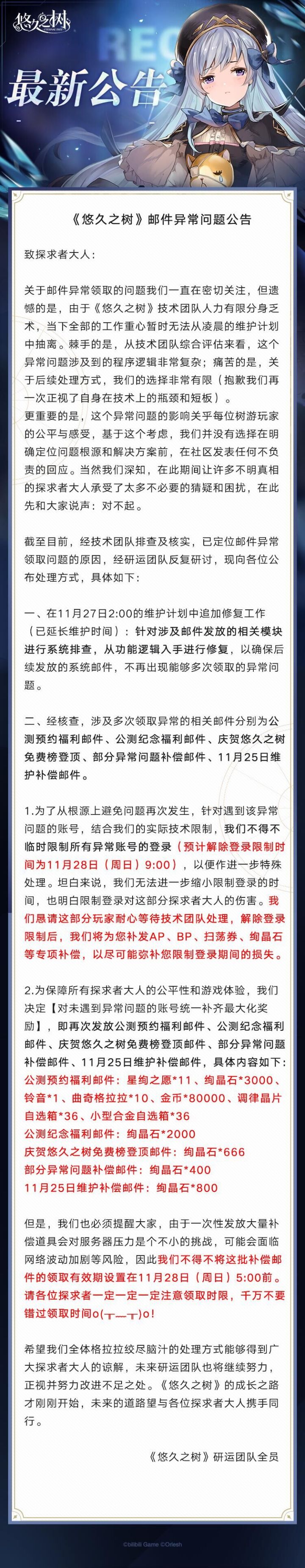 致探求者大人:《悠久之树》全平台公测开服以来,我们已陆续收到大量问题反馈,为尝试修复异常问题,我们将于11月27日2:00起对全服进行停机维护,预计维护时间为2小时。我们深知目前版本仍存在许多显而易见的问题,在此《悠久之树》研运团队再次向大家致以最诚挚的歉意。本次维护结束后,您将获得常规维护补偿【绚晶石*400】及问卷参与奖励【绚晶石*600】,以及异常问题专项补偿【尼奥德*500000、大瓶精力药水*12】。除此之外,我们还将向全服额外发放【绚晶石*2000】的特别补偿。具体问题说明详见长图,感谢您对《悠久之树》的支持!