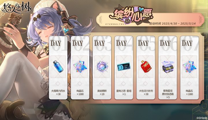◇活动时间◇4月30日 维护后 - 5月14日 10:00◇活动说明◇活动期间,探求者大人累计签到达到指定天数即可在【缤纷心愿】活动面板领取大瓶精力药水、大包活力补剂、绚晶石、星绚之愿·套组及养成素材等奖励!※详细发放内容以游戏实际内容为准。悠久之树玩家四群:1033940807官方玩家交流QQ频道:youjiuzhishu