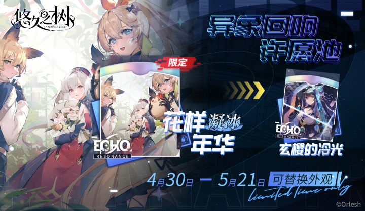 ◇许愿时间◇4月30日 维护后 - 5月21日 10:00◇活动说明◇活动期间,全新水属性异象回响「花样年华」登场,且凝聚概率大幅提升!异象回响「花样年华」拥有与诸神祝福2期回响「玄樱的冷光」完全一致的性能,并可在未来版本将其作为回响「玄樱的冷光」的外观使用。获得该回响后,探求者大人还可通过成就界面解锁1个专属头像!在本许愿池内许愿累计达到80次时,可领取UP回响「花样年华」×1!【