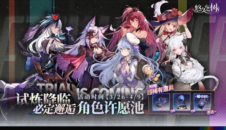 ◇许愿时间◇3月26日 维护后 - 4月9日 10:00◇活动说明◇活动期间,试炼降临-必定邂逅角色许愿池限时开放!在该许愿池内许愿时,10次许愿内必定邂逅1名SSR稀有度角色,且可额外可获赠限定礼物【奇珍秘宝自选箱Ⅰ*1】,使用后可自选获得【极致的证明*1】【箱庭奏者*1】【万灵许愿签*60】中的任意一种礼物!必定邂逅角色范围如下:【火】彼岸的银之花·瓦沙克【火】如同浮云的飘摇剑士·