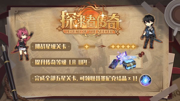 全新常驻玩法「探求者传奇」将在1月8日更新后上线!◇活动说明◇挑战星级关卡,提升传奇等级,获取超值奖励!在「探求者传奇」玩法中,通关关卡即可获得传奇经验值!根据已完成的关卡数量,探求者大人可领取高级突破素材自选箱、神狱核心、极致的证明等大量养成素材奖励;提升传奇等级,还可领取SSR稀有度回响自选箱、箱庭奏者、奇珍秘宝自选箱等珍贵道具与全新专属称号!探求者大人们将从一星关卡开始挑战,完成当前