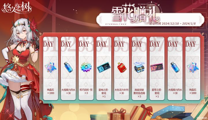 ◇活动时间◇12月18日 维护后 – 1月8日 10:00◇活动说明◇活动期间,探求者大人累计签到达到指定天数即可在【雪花赠礼】活动面板领取星导之愿·套组、星绚之愿·套组、高级突破素材自选箱、绚晶石等奖励等奖励!※详细发放内容以游戏实际内容为准。