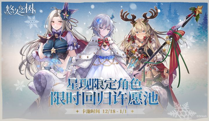 ◇许愿时间◇12月18日 维护后 - 1月1日 10:00◇活动说明◇活动期间,星现限定角色限时回归许愿池即将开启!「新装的辉光·埃尔莎」「星夜的回忆·伊斯塔」「沐雪的星现龙女·冬至」限时回归,且在本许愿池内邂逅概率大幅提升!在本许愿池内许愿累计达到120次时,可领取能够邂逅以上三名角色之一的角色自选箱~※更多许愿池详情请参见游戏内相关公告。
