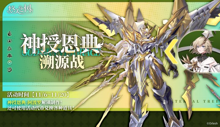 #悠久之树# 神授恩典溯源战即将开始!◇活动时间◇11月6日 维护后 - 11月20日 10:00◇活动说明◇活动期间,探求者大人挑战关卡可获得新素材与活动专属货币。使用新素材可在工坊内制作此前只能在许愿池中凝结的神授恩典系列虚数体阿波罗!神授恩典溯源战活动商店将同时开放。探求者大人们可使用活动专用货币兑换丰厚奖励!其他属性的神授恩典溯源战将在未来不定期开放,届时将解锁对应的神授恩典虚
