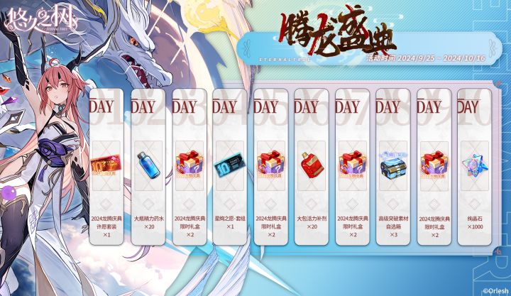 ◇活动时间◇9月25日 维护后 – 10月16日 10:00◇活动说明◇活动期间,探求者大人累计签到达到指定天数,即可在【腾龙盛典】活动面板领取龙腾庆典许愿套组、龙腾庆典限时礼盒、星绚之愿·套组、绚晶石等奖励!「龙腾庆典许愿套组」可用于在【2024龙腾庆典特别许愿池】中进行许愿。开启「龙腾庆典限时礼盒」,必定获得「龙腾庆典纪念币」,还有概率获得各种素材与包括绚晶石在内的珍贵道具!使用「龙