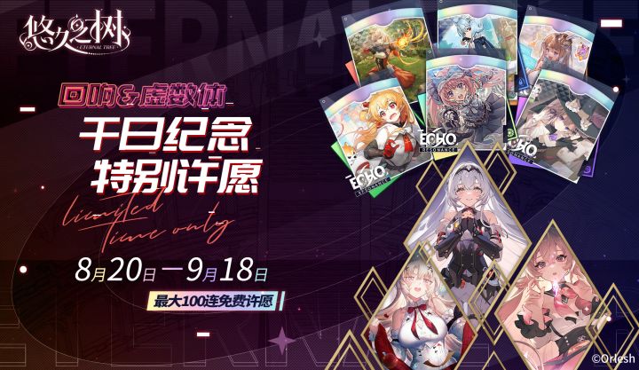 ◇许愿时间◇8月20日 维护后 – 9月18日 14:00千日纪念-特别角色许愿池,即将开放!探求者大人们可以从6种属性中选择一种在以该属性的回响与虚数体为UP对象的许愿池内进行许愿!可凝聚的回响/虚数体范围为2024年5月21日前已进入许愿池的全部回响/虚数体。◇详细规则◇1. 选择UP属性后,该UP属性回响、虚数体在本许愿池内凝聚概率大幅提升!2. 选择UP属性后,非该UP属性的回响