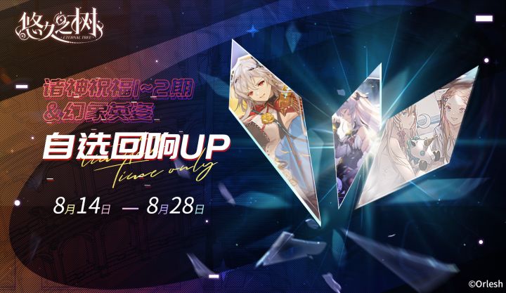 ◇许愿时间◇8月14日 维护后 – 8月28日 14:00活动期间,新回响&虚数体UP许愿池限时开放,新诸神祝福4期系列限定光属性SSR回响「煌光·可否与我共舞」、新神授恩典·起源系列光属性虚数体「阿波罗[A.I.]」加入许愿池,且在本许愿池内的凝聚概率大幅提升!在本许愿池内累计许愿次数达到80次时,可领取UP回响「可否与我共舞」×1!【特别提醒】:活动结束后,该许愿池的UP回响「煌光·可