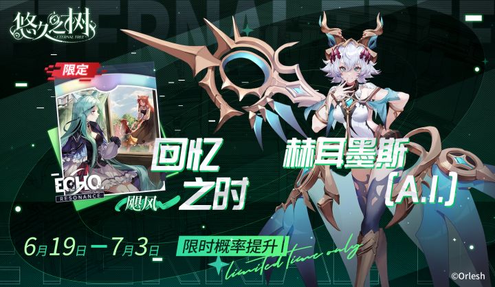 #悠久之树 【限定许愿】「飓风·回忆之时」&「赫耳墨斯[A.I.]」限时概率提升~!◇许愿时间◇6月19日 维护后 – 7月3日 14:00活动期间,新回响&虚数体UP许愿池限时开放,新诸神祝福4期系列限定风属性SSR回响「飓风·回忆之时」、新神授恩典·起源系列风属性虚数体「赫耳墨斯[A.I.]」加入许愿池,且在本许愿池内的凝聚概率大幅提升!在本许愿池内累计许愿次数达到80次时,可