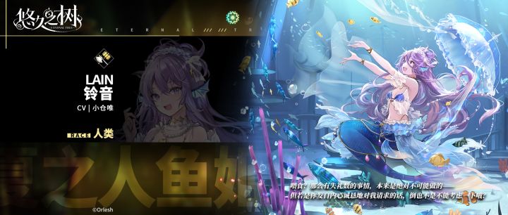 #悠久之树 #角色档案◇铃音 /Lain◇属性/光◇类型/防御◇武器/斧锤◇年龄/16岁◇CV/小仓唯传说中的人鱼公主创造了超出铃音预期的商业成果,不得不说这位淑女有着敏锐的商业目光。人气绝佳的甜品店“奈莉德之梦”不论在哪里都备受瞩目!「夏之人鱼姬·铃音」,将在近期上线。