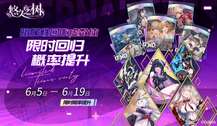 #悠久之树 【限定许愿】暗属性回响虚数体限时概率提升~!◇许愿时间◇6月5日 维护后 – 6月19日 14:00◇活动说明◇活动期间,全系列暗属性回响限时回归!且暗属性回响、暗属性虚数体在本许愿池内邂逅概率大幅提升!在本许愿池内许愿累计达到80次时,可领取SSR回响「坠落天使」1个+奏鸣币10个。※更多许愿池详情请参见游戏内相关公告。