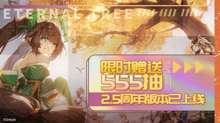 #悠久之树 #2.5周年庆典 555连免费送,悠久之树新版本2.5周年庆版本已正式上线!- 登录最高领取总计555连许愿池免费许愿机会,完成2.5周年签到活动与限定任务,获取更多重磅福利!- 新玩法·神眠之地重磅登场!- 新限定角色「与你相伴的夏日真龙 · 盈缺」 、新SP稀有度角色「神狱之主·腾蛇」登场!- 新剧情活动「雾梦明珠」登场!- 「诸神祝福自选回响UP」许愿池开启,活动期间免