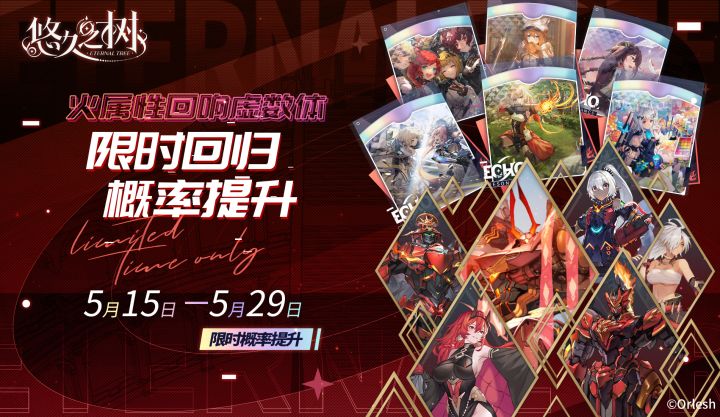 #悠久之树 【限定许愿】火属性回响虚数体限时概率提升~!◇许愿时间◇5月15日 维护后 – 5月29日 14:00◇活动说明◇活动期间,全系列火属性回响限时回归!且火属性回响、火属性虚数体在本许愿池内邂逅概率大幅提升!在本许愿池内许愿累计达到80次时,可领取SSR回响「出演成功纪念」1个+奏鸣币10个。※更多许愿池详情请参见游戏内相关公告。