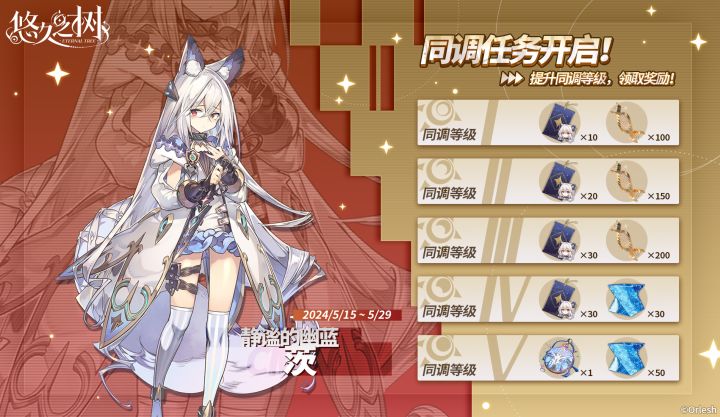 #悠久之树 同调任务·茨即将开启!◇活动时间◇5月15日 维护后 – 5月29日 14:00活动期间,提升新角色「静谧的幽蓝·茨」的同调等级,即可获取新角色的许愿签等道具奖励!将同调等级提升至4级,总共可获得许愿签·[静谧的幽蓝]茨×90。将同调等级提升至5级,可获得银色誓言×1!※更多活动详情请参见游戏内活动面板。