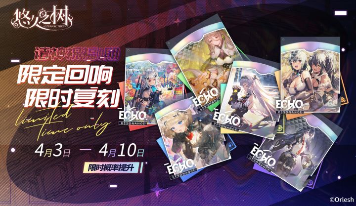 #悠久之树# 【限时复刻】诸神祝福2期限定回响限时回归许愿池即将开启~!◇许愿时间◇4月3日 维护后 – 4月10日 14:00◇活动说明◇活动期间,限定回响回归许愿池限时开放!限定SSR回响「救援行动」「为守护而战」「睡衣派对」「玄樱的冷光」「天文至点的一日·落幕」「月光下的守望」限时回归,且在本许愿池内邂逅概率大幅提升!在本许愿池内许愿,许愿累计达到80次时,可自选领取限时UP回响中
