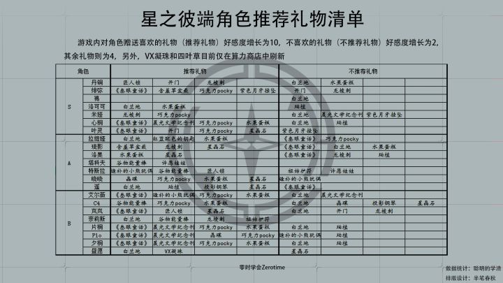 星之彼端角色推荐礼物#星之彼端#不少小伙伴在要,就赶着汇总整理了一下有关礼物好感度的数据,有错误欢迎指出