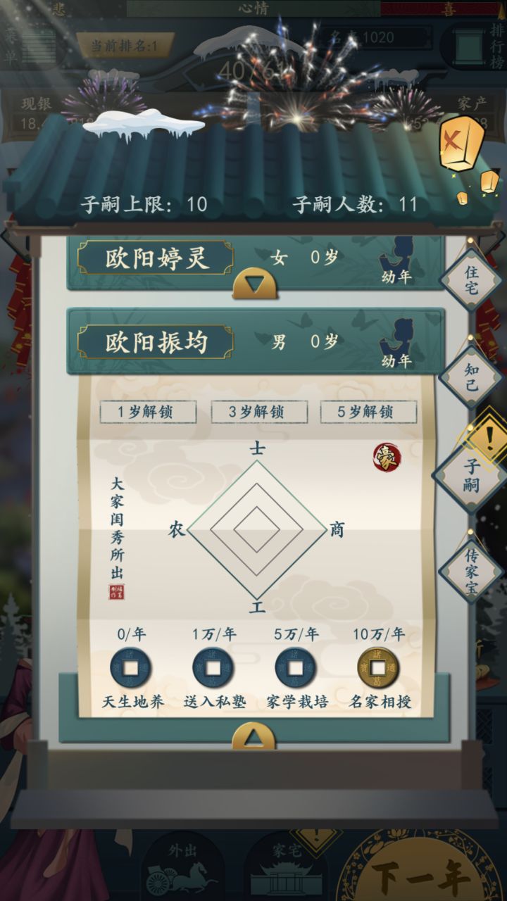 今天通过三次的测试发现大家闺秀在龙凤胎的出现率高于其他女性,而这点也让我涌出了一个想法,那么如果每次都是龙凤胎或者不低于4次的龙凤胎会怎么样呢?结果就出来了,真能打破子嗣数量的禁锢