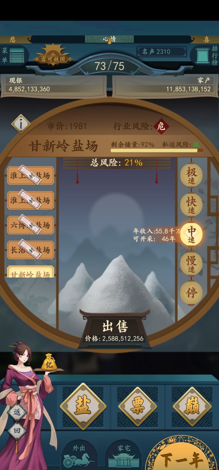 一亿小目标完成后就开启了天坑盐矿了要是玩不好就会这个样子这时候郡主就很关键了 家宅和谐等级二级就可以减少20%风险(也要有些运气刚好都是天地人)自己的产业没有风险 后期收入一般还比钱庄高 但是想要暴富 还是要有钱庄一个商资质好的管理 基本上风险在50~60都可以正常运行最后还是要看脸的 最后几年万一减少风险特别少了 换另一个也来不及 基本上就凉凉 可以选择卖总行然后~赌鸡升天第一次写攻