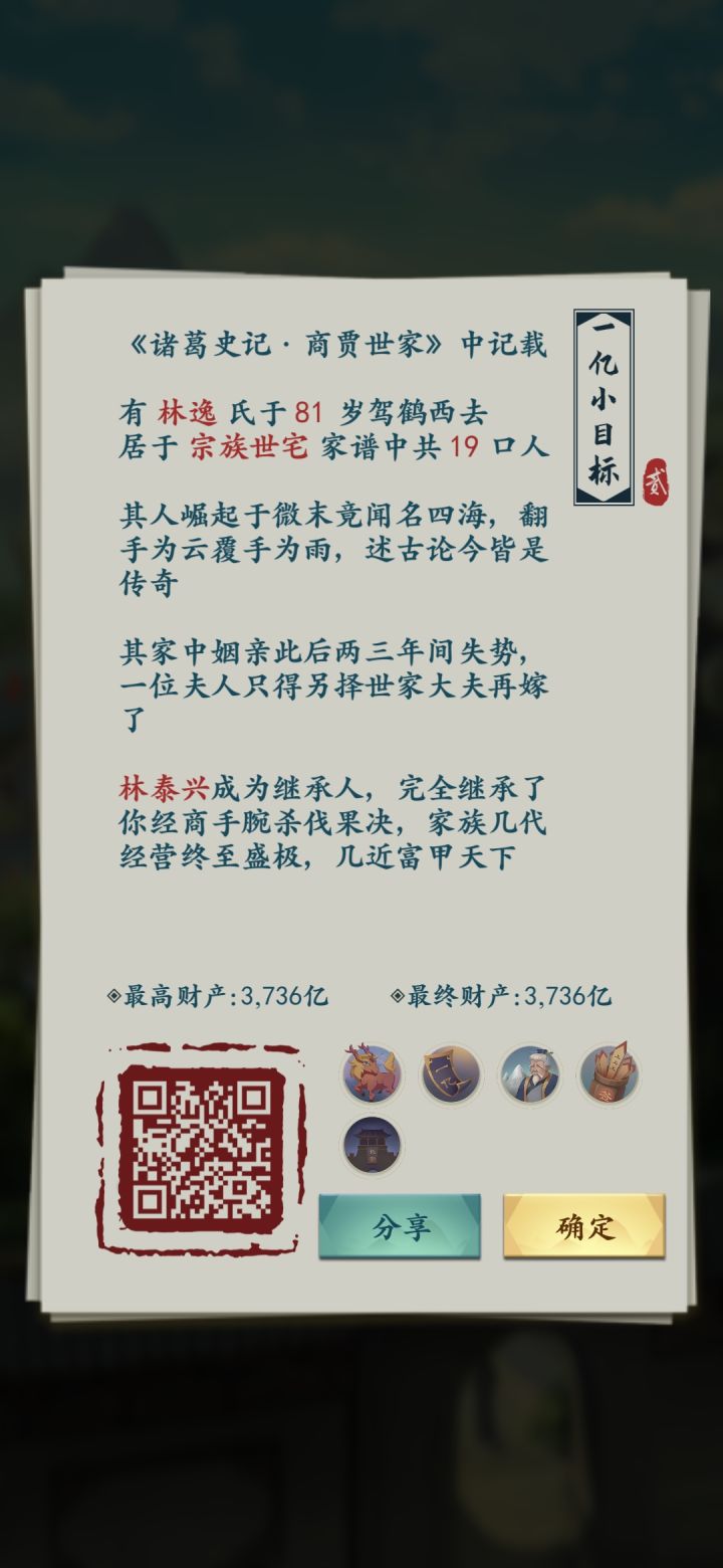 家族没有点多少天赋,开钱庄破产了两次,注资了一次,其中一次破产到无法注资,直接跑路。盐矿全部永久封锁。无ssr,无加仓库。方法很简单1.利用那10次广告保证前期赚到足够多的钱。2.尽早娶花魁,大概是在达到千万富翁的时候,我娶了她,然后不断的和他生,重点培养孩子,他的孩子商业属性特别高,一开始可以用于打理实业。3.然后就是重点了,让商业特别高的孩子打理钱庄,盐矿没必要太亏了。4.名声可以通