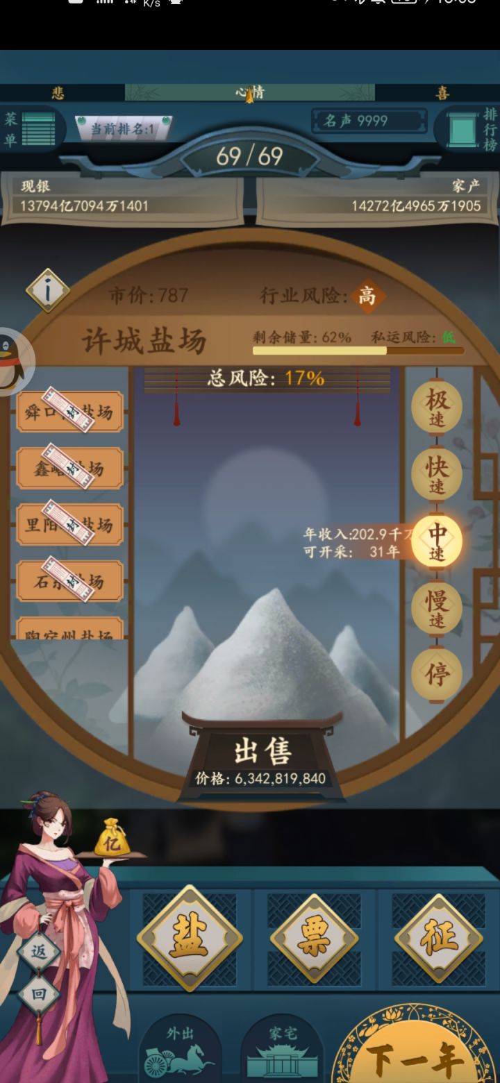 留个纪念,哈哈哈,玩了好多次,终于成了总结下来盐场盈利是最难的,我是50岁才开盐矿,带着三花郡主也开的战战兢兢,上一次就输了盐场,这次还特意把每一年盐场的盈利都写下来,方便计算。风险高的时候就全停了,低风险也不飘,老老实实点中速开采。我感觉吧,运气还挺重要的,这一局马很配合的暴涨两次,一匹暴涨的马就50万,货物盈利稳赢。知己开出来属性也很配合,三花豆腐西施每年加40仓库,不用浪费钱去买。戏