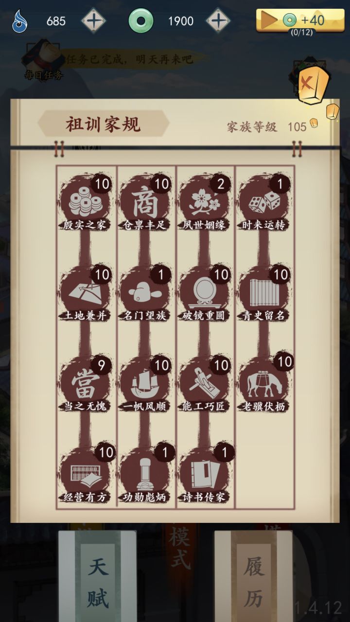刚开始玩,如果有条件一定要把初始资金天赋,升满过前几年很容易。船队能升级尽量升级有了渔女这个知己后就可以选她,被包养真的特别舒服。传家宝用时间看广告得到SSR后其实不用在一直看下去了,用免费的N和R进行升级有2星就差不多了。玩的时候,先建造0年的,商铺,有字画摊,裁缝店,更好不用升满级6级其实就差不多了(时间推移会自动升级)钱过100万后可以建造需要时长的,但别是3年的,占地,又没收益,就不