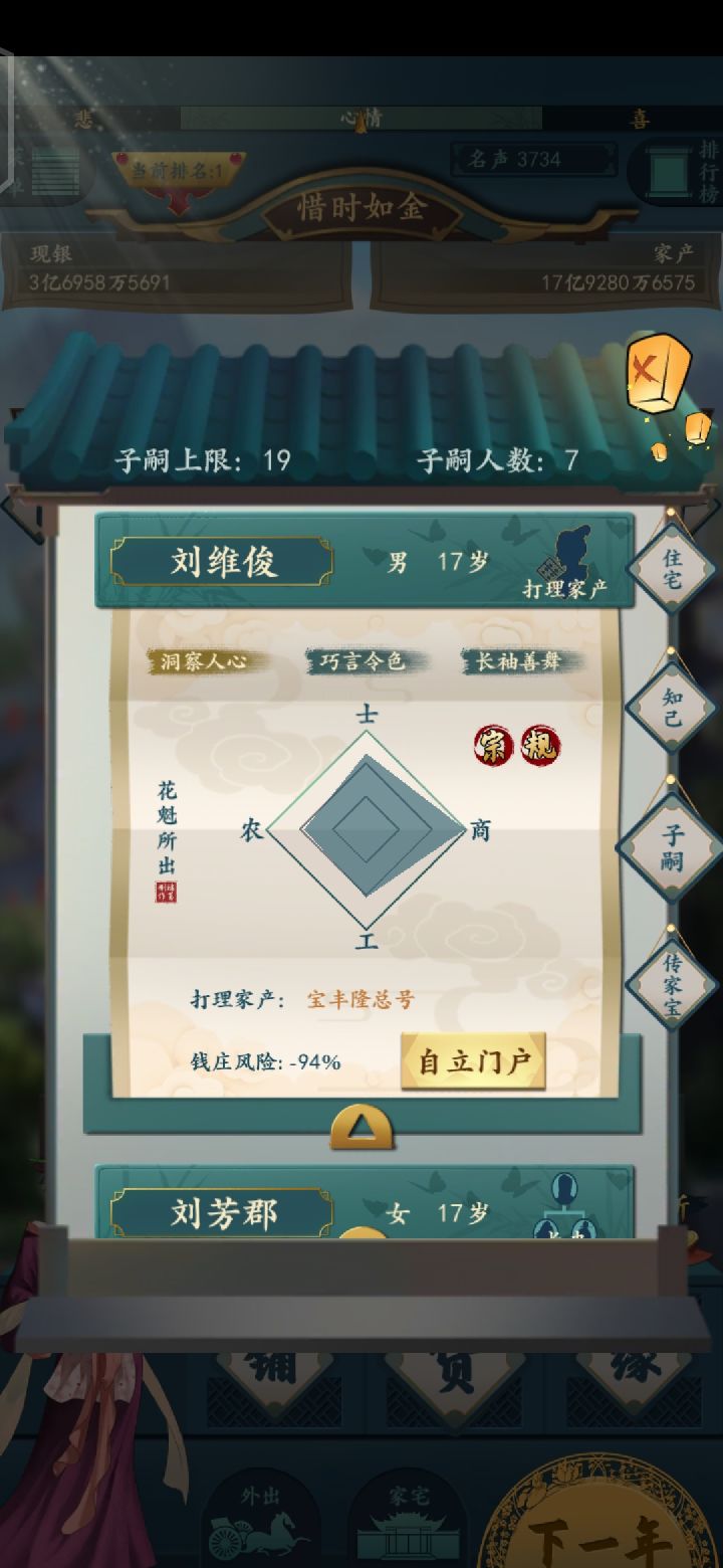 在世财神呢基本就是名声9400以上,孩子加知己25个,祈福和喝花酒都到2亿多,斗鸡700亿左右,盐矿赚钱700亿左右,买卖货物7亿左右 ,产业赚钱500亿左右,仓库1700个左右,钱庄吸纳存款越多越好总资产在8000亿左右,这样基本就是稳过了