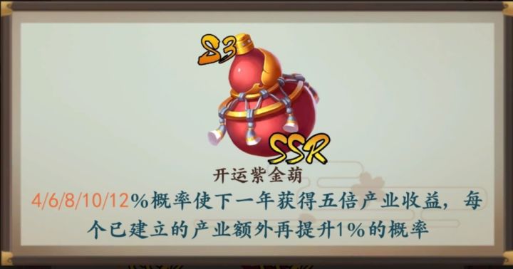 首先是S3限定传家宝开运资金葫的技能介绍吧,图片直接摆这儿啦:技能里有几个点,有好几个人发问了,这里综合起来一起解释: 触发时间 和传国玉璧一样,每年都有几率会触发,触发葫芦效果时会有提示: 在当年触发葫芦效果后,先自行进行当年操作,点击下一年后会有全屏特效(五倍盈利)。 触发概率基础触发概率和星级有关,详细的上面的图片里有。额外触发概率与已建立的产业数量有关,也就是说仅有土地是没用的