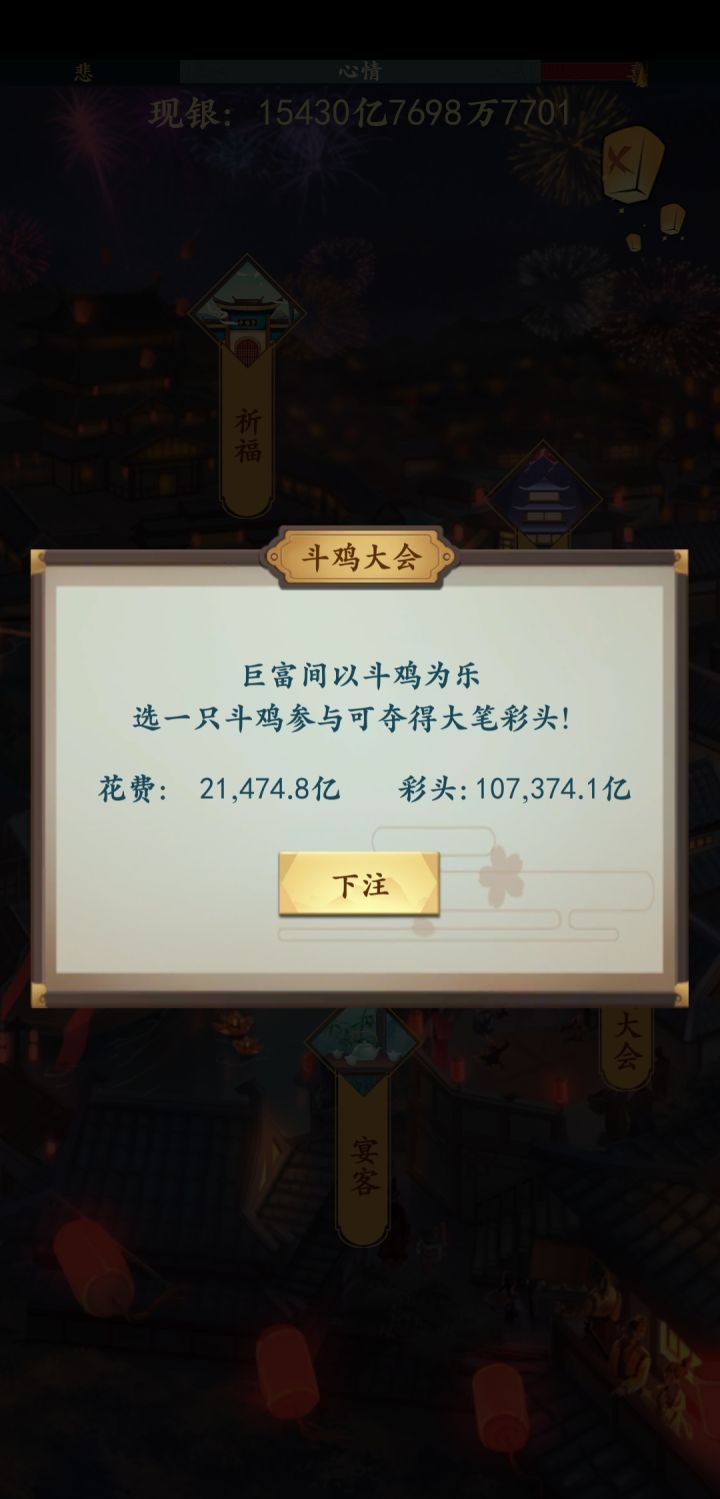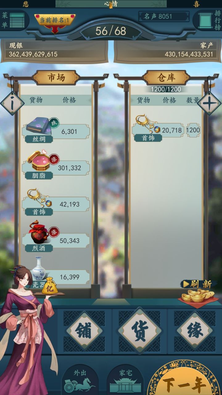 首先我谈一谈对这个游戏的看法:1,非常看前期 很多人上不去高分都输在了前期 不知道前期怎么操作 导致有钱了之后已经40-50岁了 那么怎么前期就有足够的资金让你操作 有更大的机会拿到高分呢 我来讲解一下前期2. 首先开局有一个丫鬟陪任意一个开局就算完美了 如果开局没有大跌就去建产业 然后升级 (建1000的 外加戏院)还有闲钱去喝花酒约花魁,花魁是全局最重要的伴侣 如果刷出来的越早 就能越早的屯