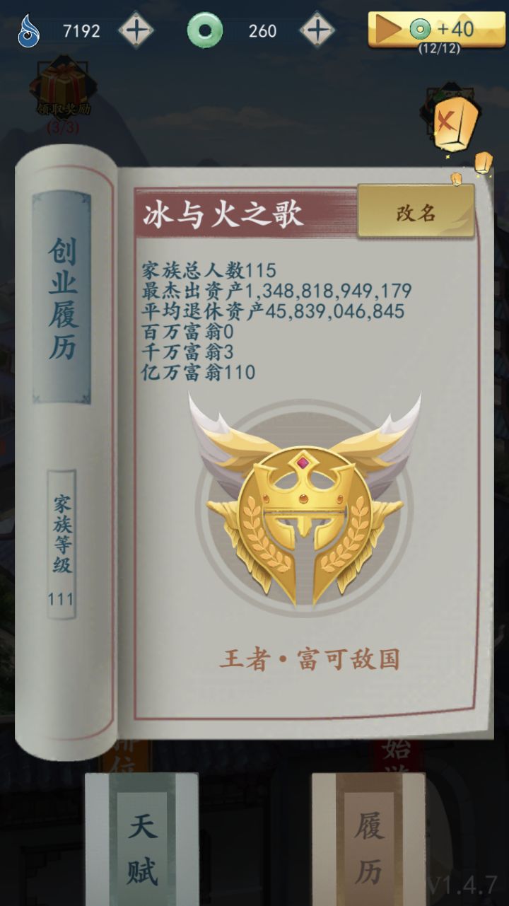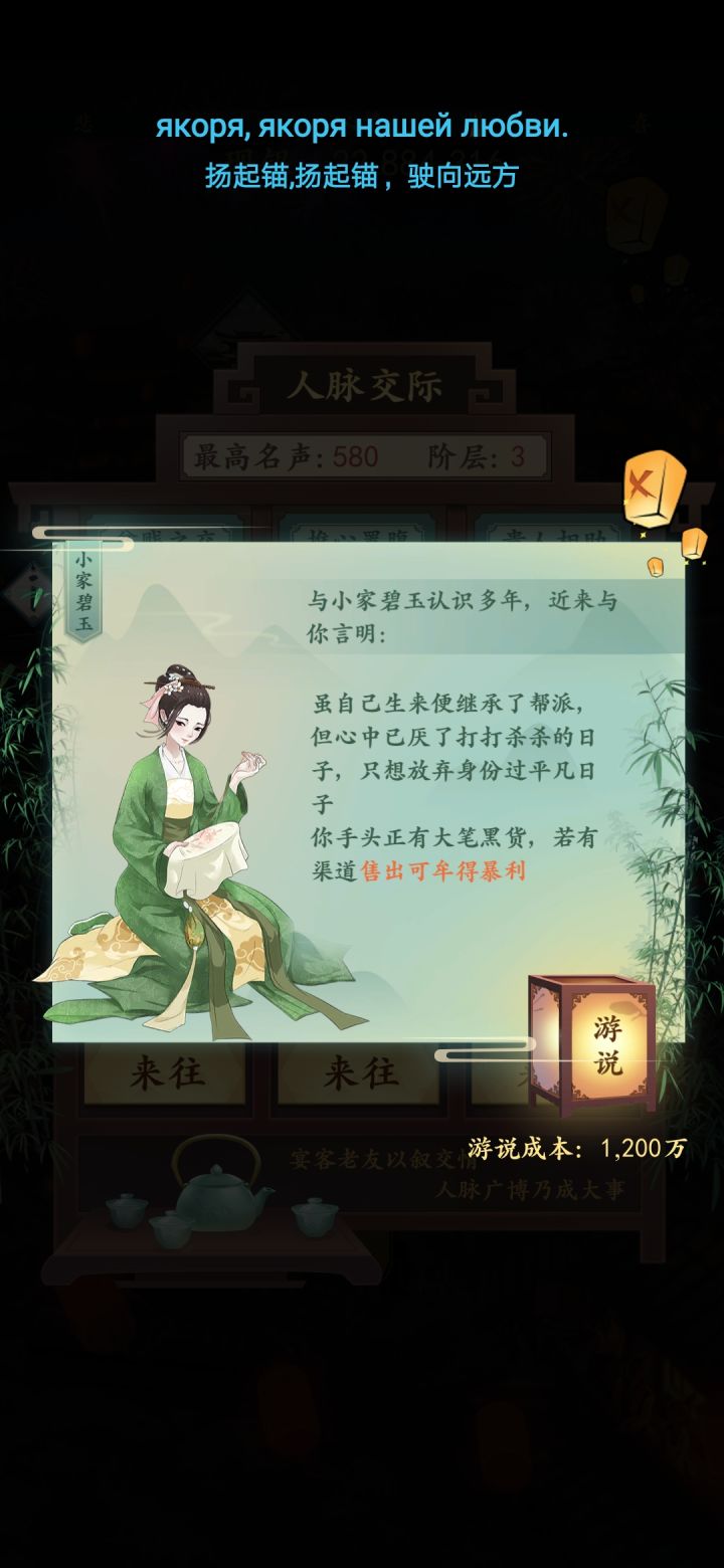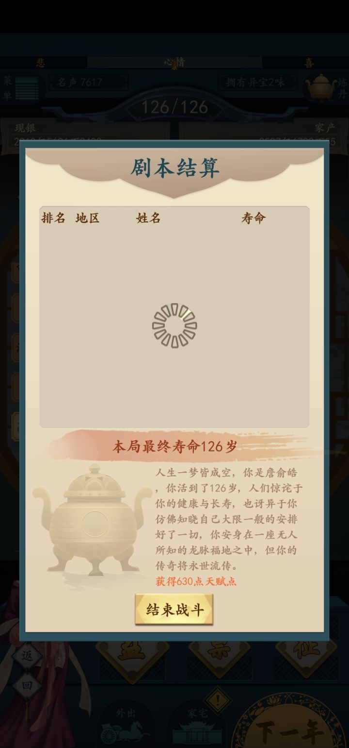 随便写个不看广告的吧。算不上攻略,至多一点心得?因为嫌麻烦,很少看广告,甚至打了很多次戏痴线。(该线真 小本生意)先说点别的,不刷广告,后期肯定很难打最后一年结算时的那个(突然忘记名字)。但是刷刷天赋点还行,一趟下来不加倍应该七八百。首先,攻略大前提是少看广告,就别扯广告更好之类。法宝里感觉那个ssr屏风(加知己),日晷(加时间)比较好用。1.惯例开头刷知己。看运气。能出小家碧玉/堂主大