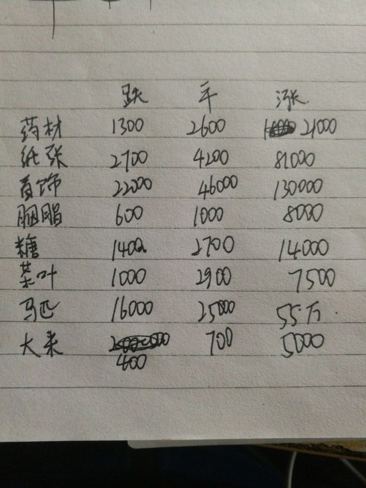小小统计了一下9个货物中8个的各个时期价格,煤炭太便宜仓库不够利润太低就没统计。有木有巨佬来完善一下,图里数值波动在百分之二十五左右,可以看出屯马和纸等大涨最合适,其他的基本都是跌买平卖就可以了,这两个是最容易一夜暴富的,当然运气不好很可能砸手里20年,这个就需要去进行一定的概率计算至少什么时候要卖,我不会,看大佬的了