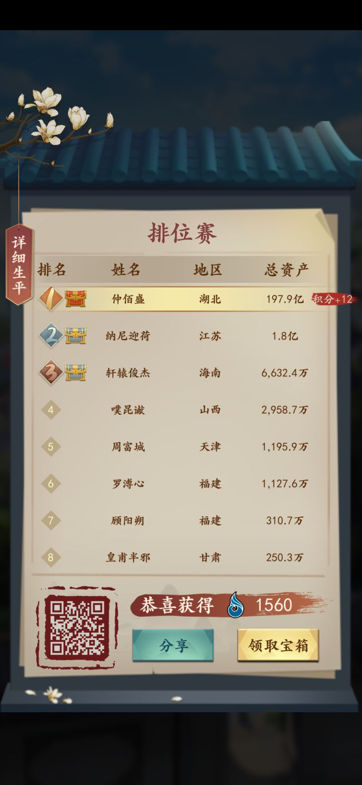 坐标温哥华,玩这个游戏俩周。完全看不了广告,连排行榜有时候都刷不出来。就这样摸索着玩。排位赛打到2000多亿也不给上排行榜。这游戏不看广告和看差距太大,海外党玩起来费劲。能不能上千亿完全看运气。前期刷小家碧玉和豆腐西施。赌货物能翻倍,赌不上一辈子无望。反正完全看运气,丢钱也不能转运,礼物也收不了。最多66岁必须老死。运气好一点几千万亿还上不了排行榜。╮( ̄▽ ̄"")╭