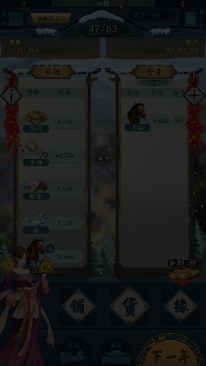 说实在的这游戏真不怎么好玩!玩了两个星期钱庄坏账率没有低于70的时候,盐矿在1的几率都频频被查封,到货买什么什么不涨价。还有就是后宫吵架你妈居然要钱每回都翻倍最多一回就是道姑居然要我160亿她妈的这是什么设定!