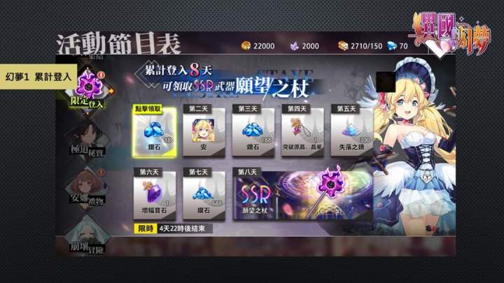 发现台服在taptap没公告,有点难受。之后随缘更新官方在fb上的公告吧(5.11前应该不会鸽,上学后就不一定了QAQ)想国服的第二天额,板块就发攻略了,有问题再说吧 我是分割线 异国的幻梦活动,限时上线!空气中弥漫着花香味,参加狂欢游行的连结者精心装扮,连结者们都换上了与平日不同的装扮,化上美丽的妆容,亚理莎都快要认不出谁是谁了! (。ŏ﹏ŏ)大家准备好一起参与「异国的幻梦」狂欢游