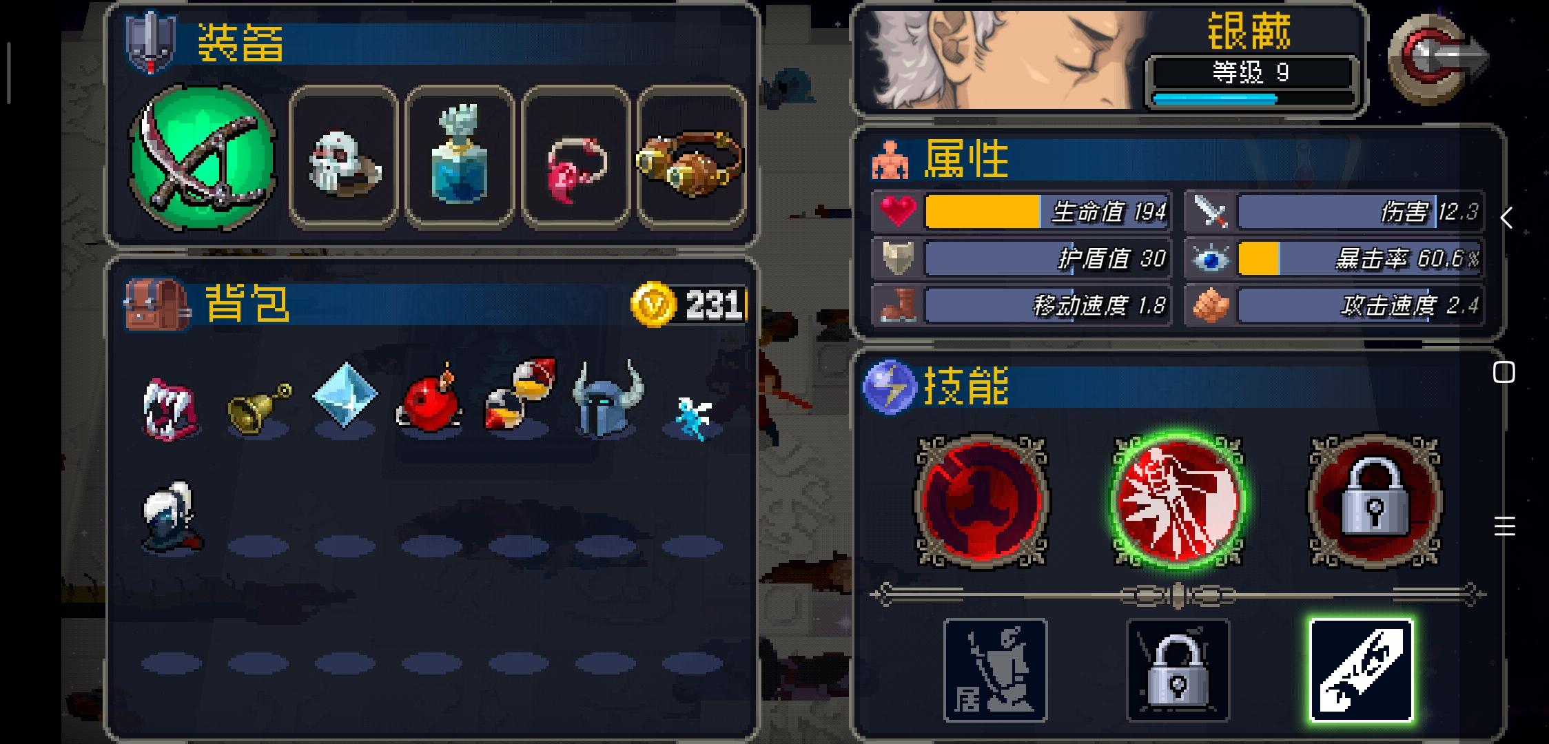 这次玩银藏运气挺好前期拿到了镰刀绿武,一直用到了最后,血量190多,加上暴击攻速暴击吸血爆伤,在线给阿修罗剃胸毛。ps:因为银藏伤害不高,加上还是绿武,我打到最后真的是手麻眼花,不过没有镰刀和吸血的银藏真的很难打传说(哭泣),求加强!